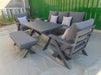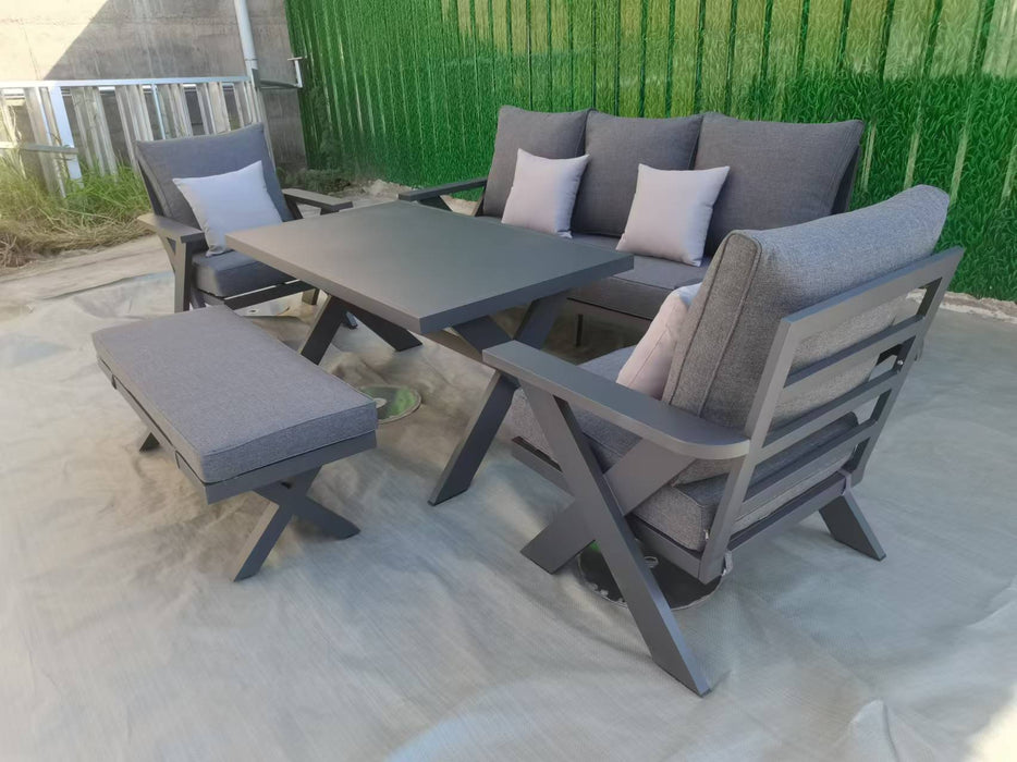 - SPACIOUS & FUNCTIONAL: This 5 piece Aluminum outdoor set includes 1 Couch, 2 Chairs, Dining table and Bench! Plenty of seating for your outdoor dining events.