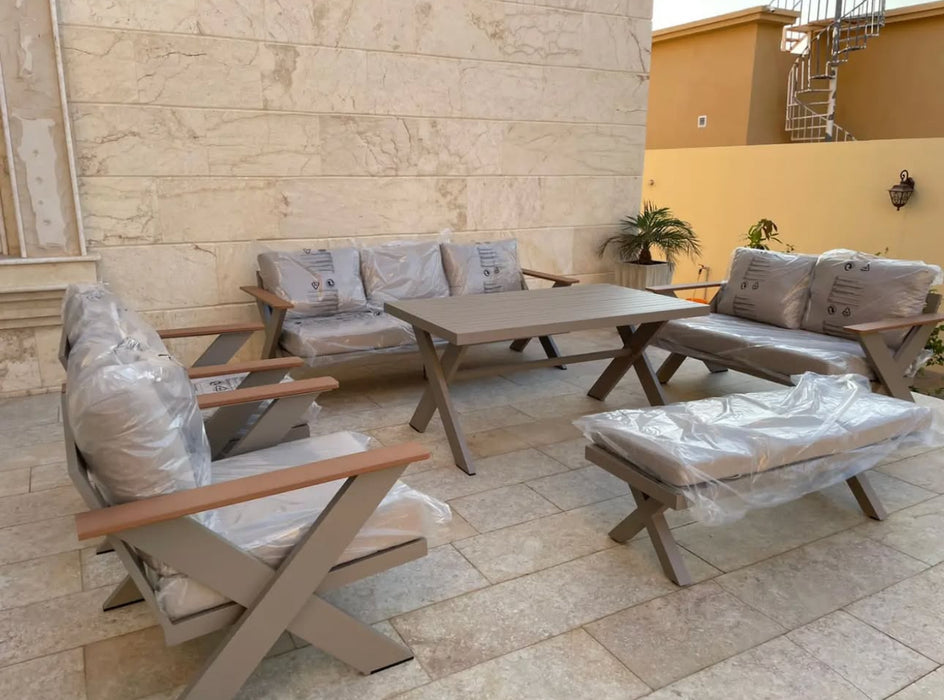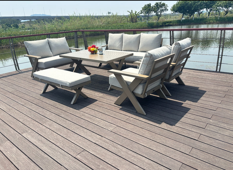 - SPACIOUS & FUNCTIONAL: This 6 piece Aluminum outdoor set includes 1 Couch, 2 Chairs, Loveseat, Dinning table and Bench! Plenty of seating for your outdoor dining events.